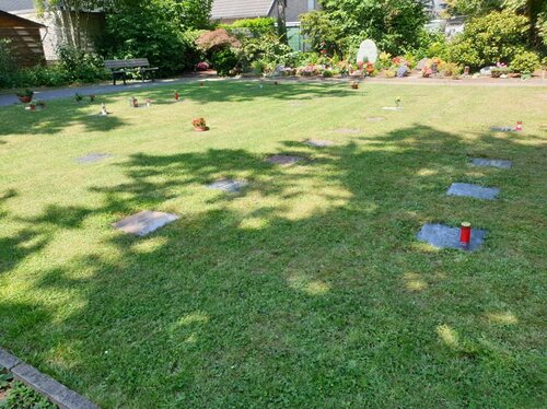 Rasenreihengrabstätten für Urnen liegen unter einer Rasenfläche und können mit einer ebenerdigen Grabplatte versehen werden.