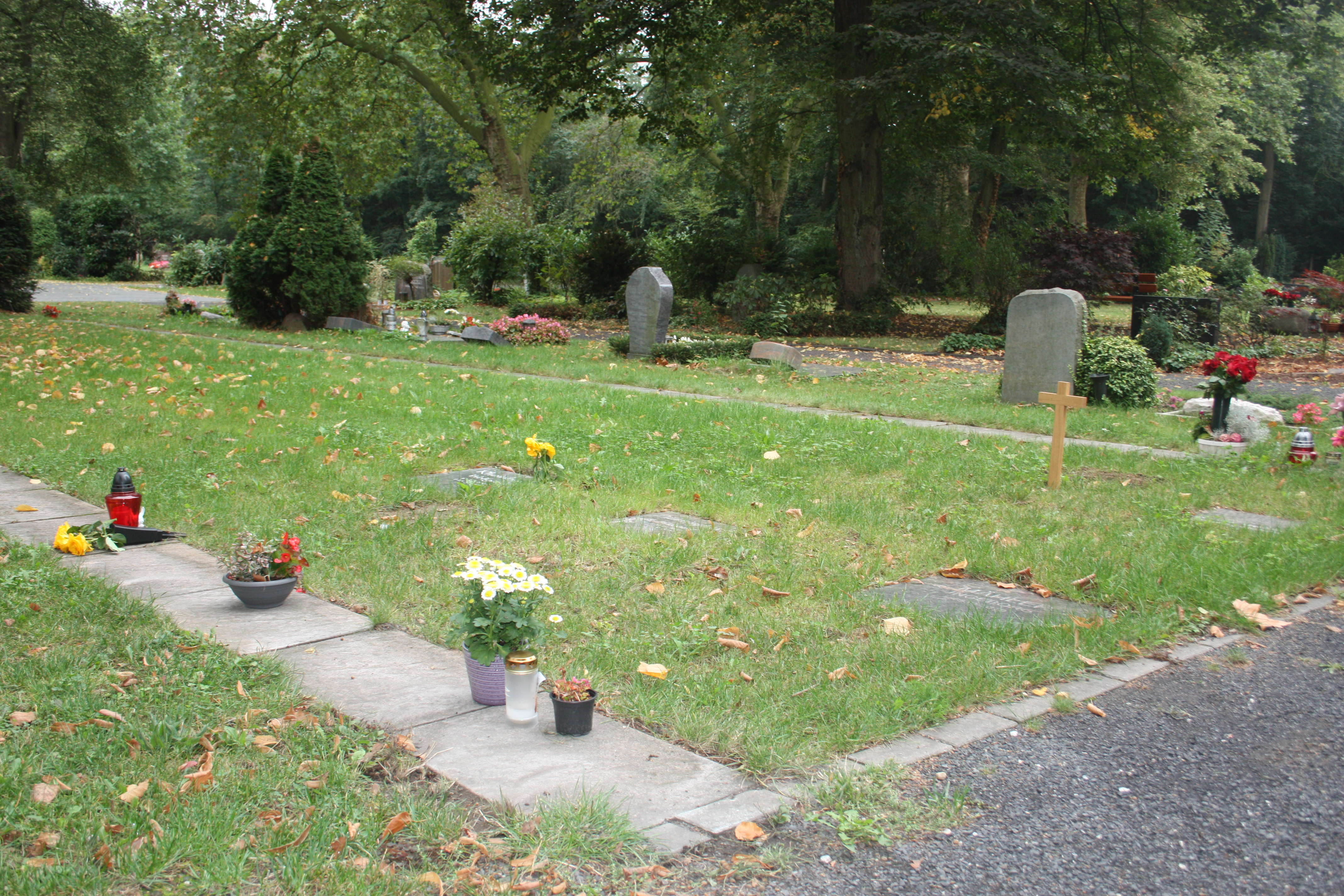 Rasenwahlgrabstätten für Särge und Urnen liegen unter einer Rasenfläche und können mit einem stehenden Grabstein oder einer ebenerdigen Grabplatte versehen werden.