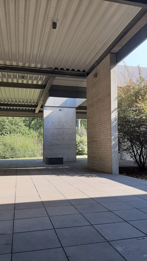 Eine 600 m² große überdachte Andachtshalle bietet den zentralen Bereich für Besucher und Trauernde. Sie lässt den Hinterbliebenen genügend Raum zur Besinnung und um sich auf den Abschied vorzubereiten sowie sich mit Freunden und Verwandten zu treffen.